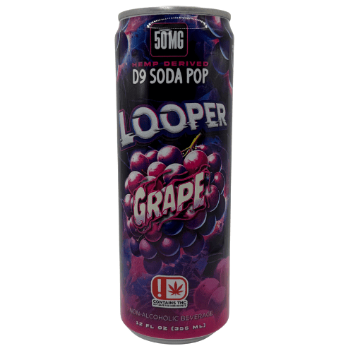 Looper Grape D9 Soda Pop es una bebida no alcohólica infusionada con 50 mg de Delta-9 derivado del cáñamo. Su formato líquido permite una absorción distinta a los comestibles sólidos, ofreciendo una experiencia progresiva y fácil de administrar al consumirla lentamente. Su sabor a uva la hace ideal para momentos sociales o de relajación. Se recomienda consumir con moderación, iniciar con pequeños sorbos y esperar antes de continuar. Mantener fuera del alcance de menores y almacenar en un lugar fresco.